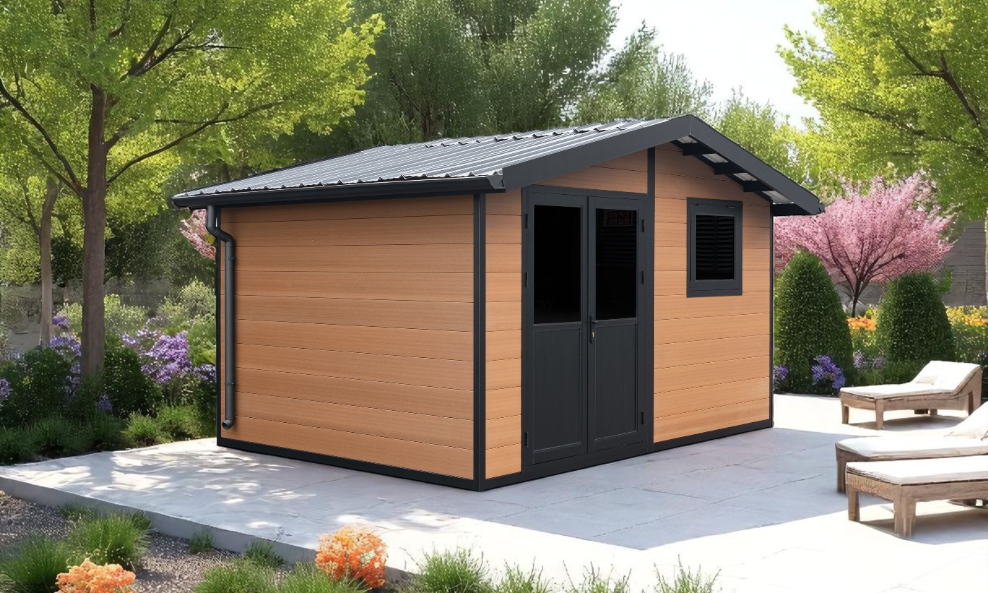 L’abri de jardin Metz en bois composite offre une surface utile d’environ 11 m2, avec un toit à deux pentes. Équipé d’une double porte semi-vitrée en aluminium, munie d’une serrure à cylindre européen pour assurer la sécurité, cet abri allie fonctionnalité et esthétique.