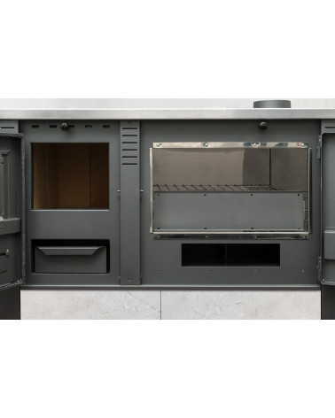 L’utilisation de bois comme combustible offre une solution de cuisson écologique et économique, réduisant votre empreinte carbone tout en créant une ambiance chaleureuse et conviviale. La large porte vitrée du four permet d’apprécier la cuisson de vos plats en temps réel, ajoutant une touche de confort visuel à la chaleur physique qu’elle procure.